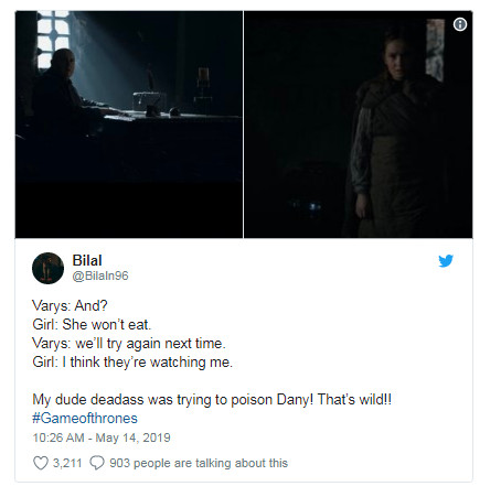 Scene itu bisa mengindikasikan gimana Daenerys bakal mati. Doi bakal mati keracunan sama makanan dari Varys. Walau kita tau Varys sudah mati duluan. Ada kemungkinan the Whisperer Martha bakal melancarkan aksi itu lagi.