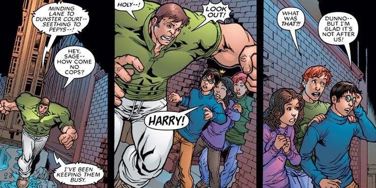Adegan tersebut mirip seperti dalam seri Harry Potter dimana para penyihir mampu menembus tembok peron 9 ¾ di salah satu stasiun kereta Inggris. Dalam salah satu panel, Juggernaut hampir menabrak ketiga remaja yang tiba-tiba muncul itu. Karakter cewek yang punya penampilan rambut pirang seperti Hermione pun berteriak “Harry!” kepada karakter berkacamata bulat layaknya Harry Potter.