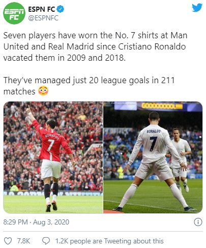 Belum lama ini, ESPN FC merilis catatan yang mengejutkan tentang para pengguna nomor 7 peninggalan Cristiano Ronaldo. Dalam unggahannya, ESPN memaparkan data bahwa sejak Ronaldo pergi, udah ada 7 orang pemain yang menggunakan nomor punggung 7 tersebut baik di Real Madrid maupun Manchester United.