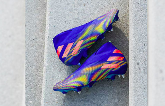 Dengan kelir dasar biru keunguan, hologram sepatu ini punya kilau emas dan nama 'Nemeziz' yang juga muncul seiring hologramnya.