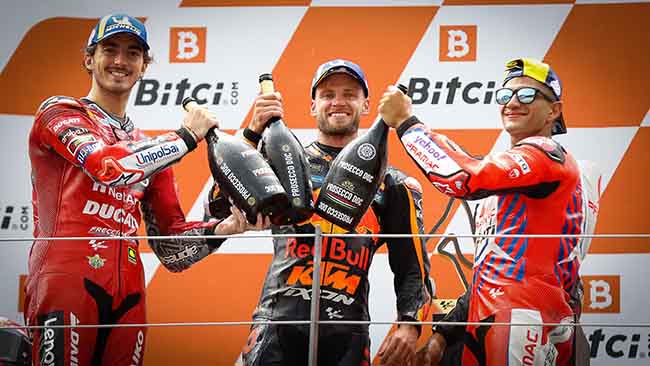 "Saya senang dengan podium. Saya menunggu lama untuk podium lain karena yang terakhir ada di Jerez. Kami banyak bekerja pada periode ini dan dalam dua pekan ini saya pikir kami telah bekerja lebih baik daripada sepanjang musim," kata Bagnaia.