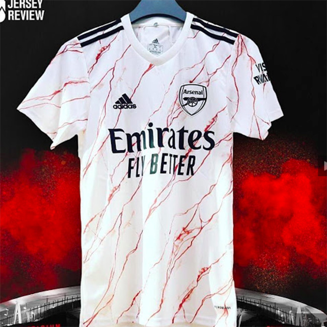 Makin unik lagi, logo Arsenal khusus di kit tandang ini, semuanya berwarna putih tanpa merah. Hanya garis dan meriamnya saja yang berkelir gelap.