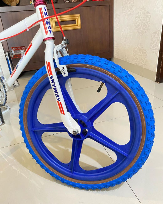 Produk Skyway yang ada di sepeda ini yang lain adalah Seatpostnya. Nggak mau ketinggalan, yang paling mencolok dari sepeda ini adalah velg Skyway berwarna biru yang dilapisi ban dengan kelir senada.