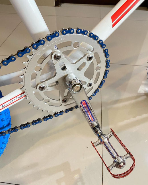 Profile racing spider dipasangin dengan Profile racing vintage box crank buat ngegerakin chainring dari Tuff Neck. Part itu bisa bergerak karena kayuhan pedal dari Mks BM7.