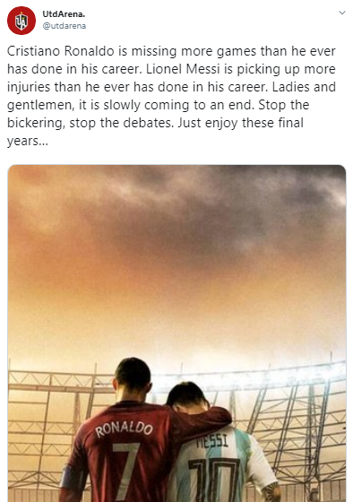 Akun tersebut kira-kira ngingetin bahwa Ronaldo udah sering melewatkan pertandingan karena dijadikan cadangan. Selain itu, mungkin sebagian dari lo juga tau bahwa Messi juga cuma main beberapa kali di awal musim ini karena terus-terusan cedera saat bertanding.