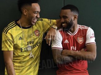 Dari foto yang beredar, striker Arsenal, Pierre-Emerick Aubameyang sudah mengenakan jersey nyentrik ini. Ia berada di samping Axandre Lacazette yang mengenakan jersey utama merah.