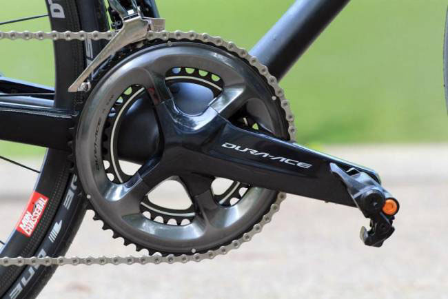 Crank Dura-Ace 12 Speed punya bentuk yang lebih kotak dengan 4 kaki. Kalau dilihat juga sih ada power meter di kedua pedalnya.