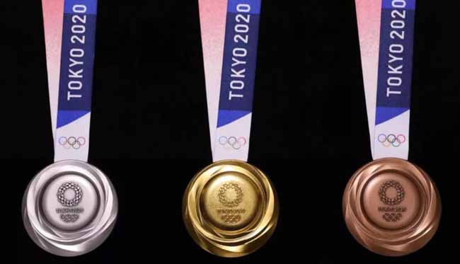 Medali emas Olimpiade Tokyo 2020 dilapisi 6 gram emas di atas perak murni. Medali peraknya terbuat dari perak murni, sementara medali perunggunya terbuat dari perunggu merah (95% copper dan 5% zinc). Desainnya terbilang unik karena menampilkan Nike, Dewi Kemenangan dalam mitologi Yunani.