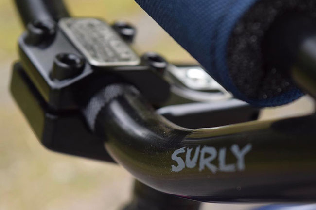 Setelah itu, di bagian kemudi ada bar dan stem dari Surly. Kedua part ini memakai komponen yang seharusnya ada di sepeda BMX. Biar nyaman, si empunya mengandalkan si kotak-kotak Oury.