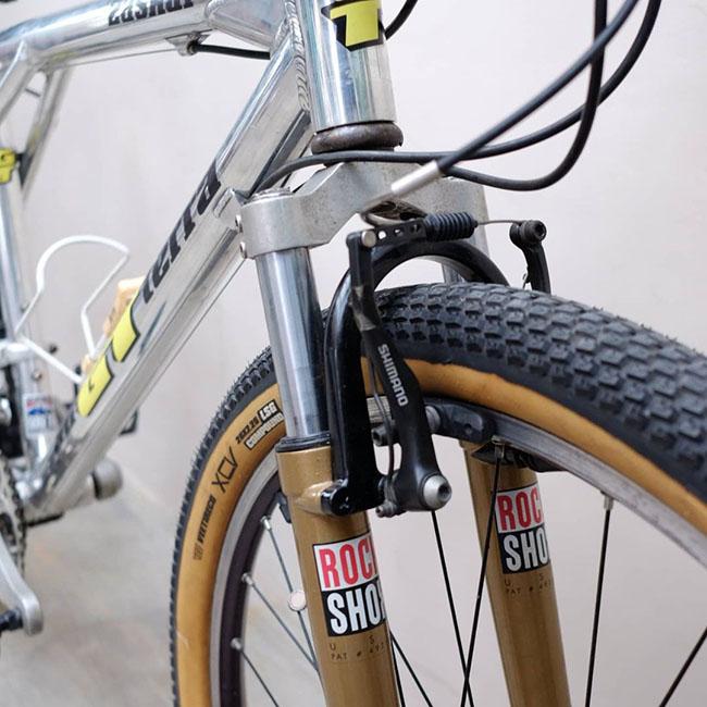 Fork itu dikombinasikan dengan ban yang punya dinding dengan warna senada dari Vee Tire ukuran 26x2.25 buat ban depan dan Schwalbe Nobby Nic ukuran 26x2.25 di belakangnya.