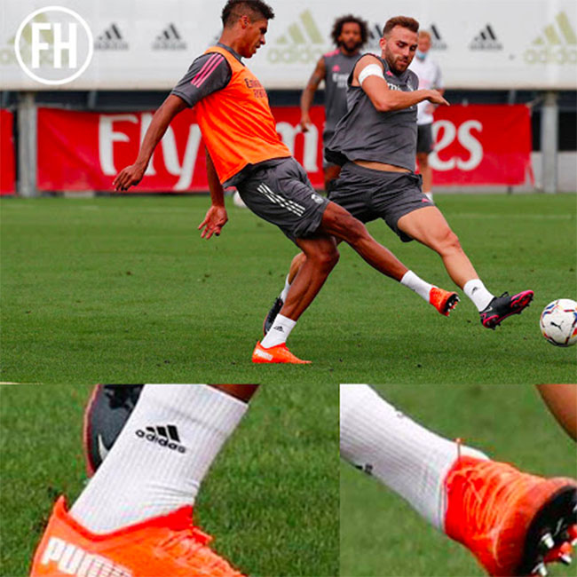 Dalam sesi latihan bersama timnya, Madrid, bek yang sudah mengangkat trofi Piala Dunia bareng Les Bleus itu tertangkap menggunakan PUMA Ultra soccer cleats silo.