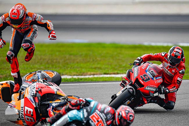 Di samping tuas rem, Marquez memulai hari dengan penyelamatan besar di Turn 2. Ia berhasil mendominasi meski berjibaku menghindari crash.