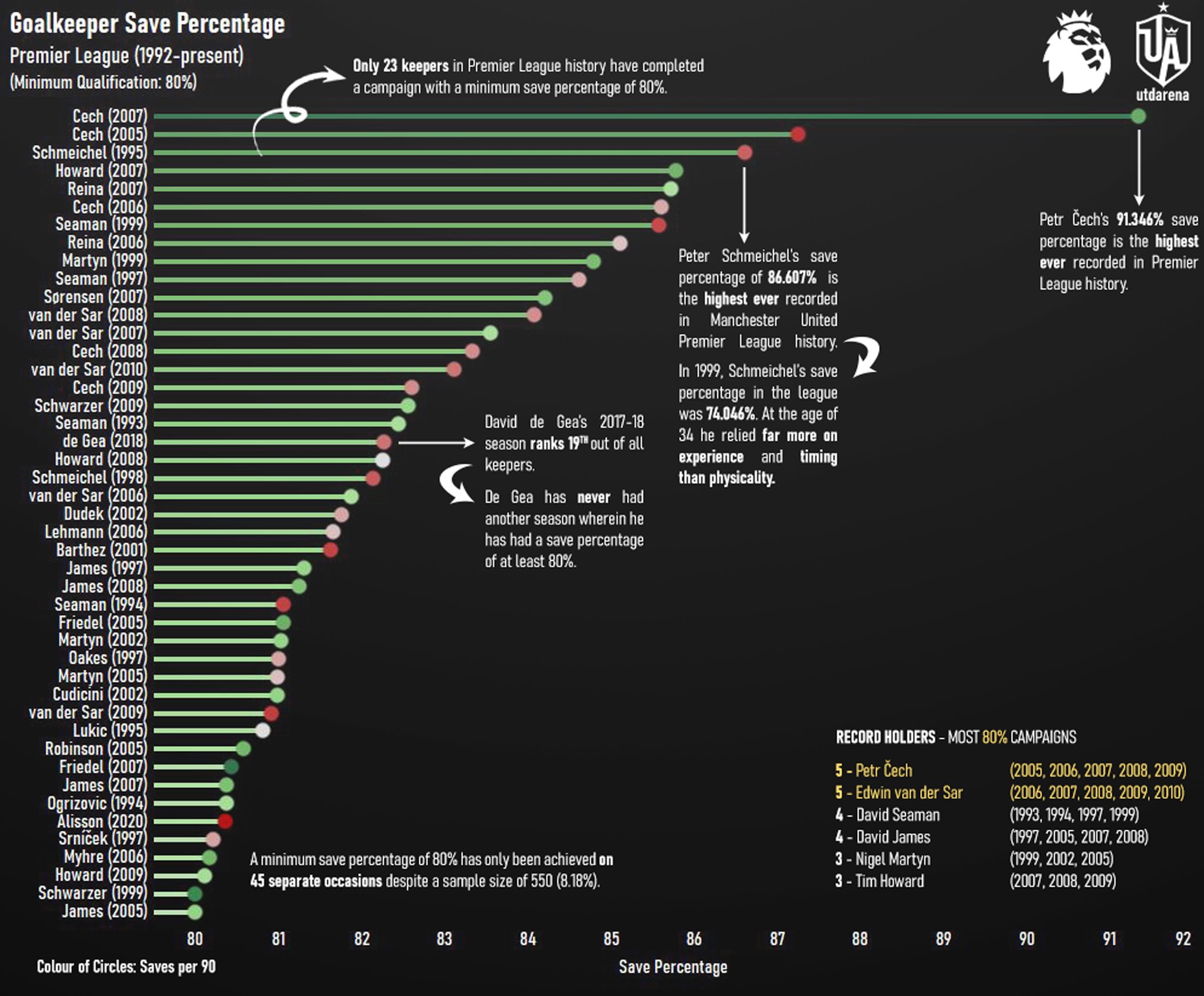 Data tersebut nunjukin kiper-kiper dengan persentase penyelamatan terbaik di setiap musim sejak 1992. Lo bisa melihat nama Petr Cech jadi yang paling atas pada daftar tersebut. Kiper yang identik dengan pelindung kepalanya ini ternyata pernah tampil dengan performa luar biasa dengan persentase penyelamatan sekitar 91%. Dengan kata lain, kiper asal Republik Ceko ini berhasil menepis lebih dari 9/10 bola yang mengarah ke gawangnya. Hal tersebut terjadi pada tahun 2007.