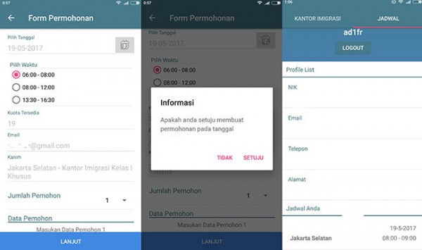 Jadi nggak ada lagi tuh yang namanya datang subuh-subuh ke kantor imigrasi supaya cepat dapat nomor antrean. Karena di aplikasi ini, loe hanya tinggal registrasi akun dengan data-data resmi, pilih jumlah pemohon dan hari permohonan pembuatan paspor.