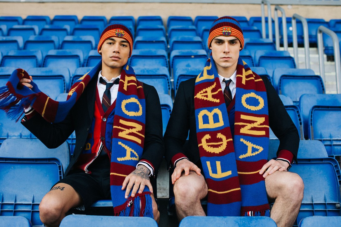 Gak cuma setelan jas, Thom Browne bersama Barcelona juga membuat cardigan, topi rajut, syal, dan sebuah handbag.