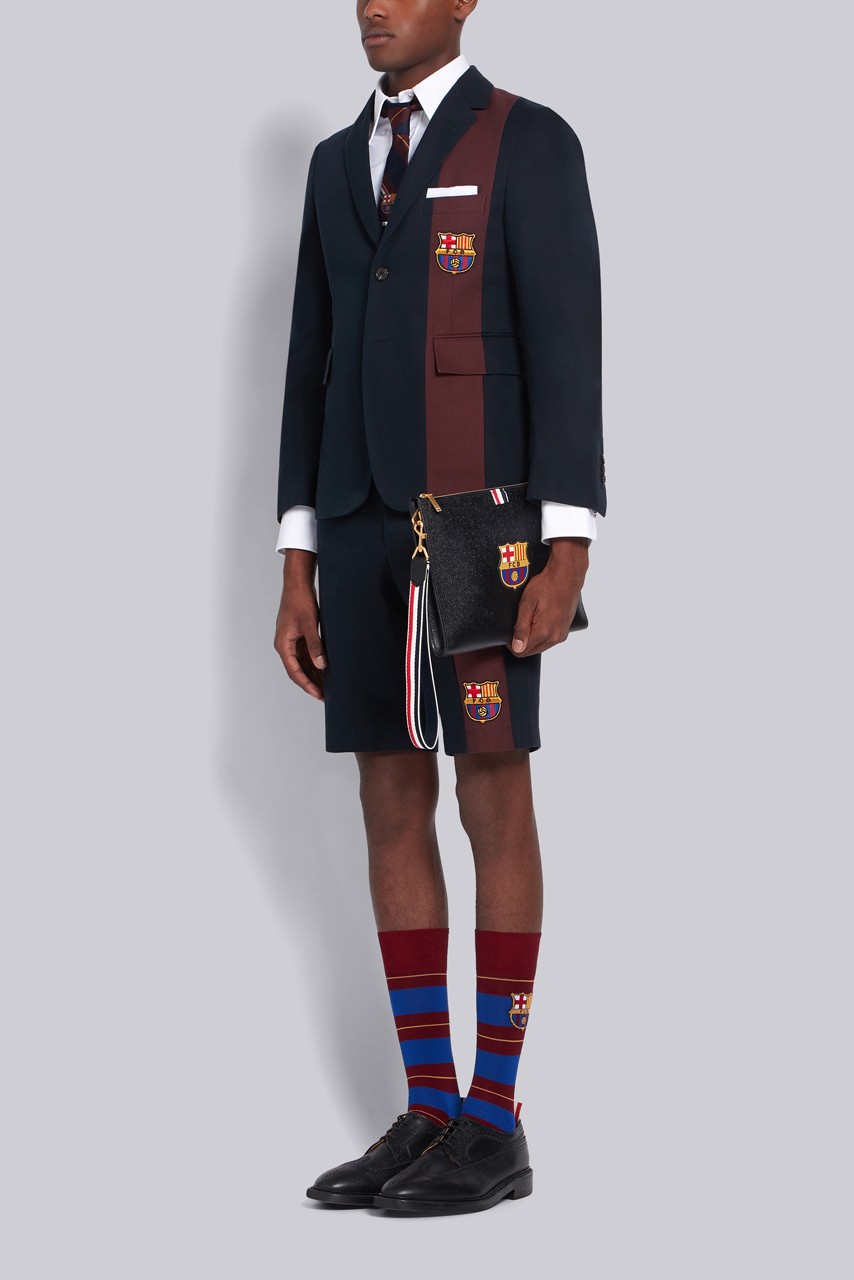 Nah uniknya, Thom Browne gak mendesain celana panjang yang formal sebagai pasangan jas tersebut. Dirinya malah mendesain sebuah celana pendek yang punya garis desain sama dan juga dengan lambang Barcelona di sebelah kiri.