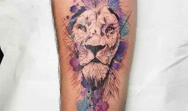 Beberapa versi, seperti singa ini, menggunakan kombinasi cat cerah dan garis hitam tajam untuk membuat tato yang benar-benar unik. Tato cat air bisa dalam berbagai ukuran, bentuk, warna, atau lokasi.
