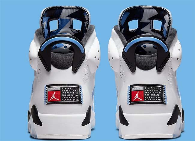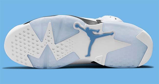 Sepatu itu bakal berbasis warna putih. Namun ada aksen biru navy di beberapa bagiannya. Tanggal rilis resmi belum diumumkan untuk "UNC" Jordan 6, tetapi harapannya musim semi 2022.