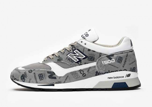Bodi sepatu M1500 versi all over logos ini didominasi oleh warna abu-abu yang terbuat dari bahan suede. Tulisan-tulisannya berwarna hitam, ditulis dalam berbagai ukuran mulai dari yang kecil banget sampai yang besar.